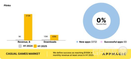 오랫동안 전체 하위 장르는 본질적으로 단일 최고 수익 타이틀인 플링코 갤럭시에 의해 정의됐다. 하지만 2025년에 상황이 변하기 시작했다. 플링코 게임들은 폭발적인 36배 연간 수익 증가를 보며 1년 전에는 거의 존재하지 않았던 틈새의 등장을 의미했다. 그 결과, 하위 장르는 이제 H1 2025에 "엄청난" 31만 6000달러 수익과 6500만 설치를 차지한다.