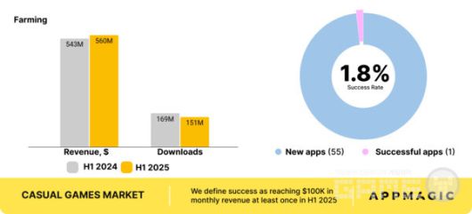 파밍은 종종 더 최근 장르들에 비해 간과되지만, 가장 큰 캐주얼 세그먼트 중 하나로 남아있고 뒤처지지 않고 있다. 그렇다, 신규 진입자들에게는 거기서 힘들다. 올해 출시된 55개의 새로운 파밍 타이틀 중 단 하나만이 월 10만 달러 벤치마크를 넘었고, 성공률을 단 1.8%로 떨어뜨렸다. 하지만 성공한 사람들은 이 공간의 게임들이 같은 트렌드를 따르고 캐주얼 시장의 나머지와 같은 도구와 기회를 완전히 활용한다는 것을 증명한다.