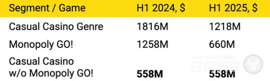 그 이유는 간단하다. 모노폴리 고가 2024년 하반기에 상당히 축소됐다. 그리고 장르에 대한 게임의 영향은 무시할 수 없다. H1 2024에만 모노폴리 고는 12억 6000만 달러를 창출했다. 이는 H1 2025에서 전체 장르가 벌어들인 것보다 많다.
