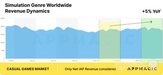 파밍은 5억 6000만 달러 수익으로 전년 대비 3% 성장했고, 1억 5100만 다운로드로 10.5% 감소했다. 대표작으로는 타운십, 헤이 데이, 패밀리 아일랜드 - 파밍 게임이 있다. 시간 관리는 8500만 달러 수익으로 2.6% 감소했고, 2억 6100만 다운로드로 2.6% 감소했다. 대표작으로는 쿠킹 다이어리 레스토랑 게임, 해피 다이너 스토리: 쿠킹, 쿠킹 매드니스: 어 셰프스 게임이 있다. 라이프 심은 8000만 달러 수익으로 30% 증가했고, 1억 4800만 다운로드로 3% 감소했다. 대표작으로는 비트라이프 - 라이프 시뮬레이터, 더 심즈 프리플레이, 심동샤오전이 있다.