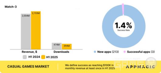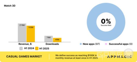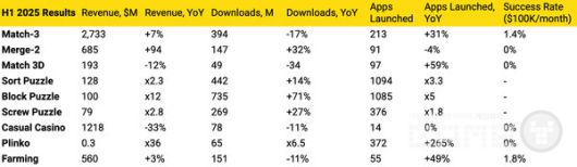 그 외에 장르는 많은 변화를 보지 않았다. 성공률이 단 1.4%로, H1 2025 동안 우리의 월 10만 달러 벤치마크를 넘어선 타이틀은 단 3개뿐이었다. 패밀리 팜 매치, 퍼즐 세븐틴, 그리고 원래 일본어 이름을 가진 동메달리스트인 "당신이 엄청나게 좋은 100명의 그녀와 삐빙 퍼즐'"이다.