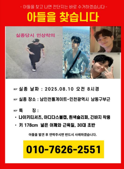 경찰과 소방당국은 실종 신고 접수 뒤 ㄱ씨를 찾고 있지만 성과가 없는 상황이다. ㄱ씨 가족은 전단을 배포하며 ㄱ씨 행방을 찾고 있다.