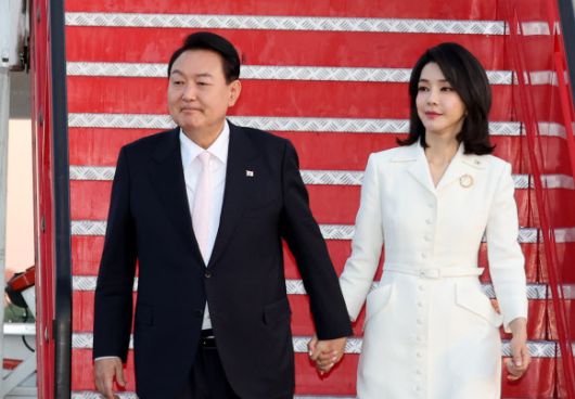 윤석열 대통령과 김건희 여사가 북대서양조약기구(나토) 정상회의 참석을 위해 27일(현지시간) 스페인 마드리드 바라하스 국제공항에 도착, 공군 1호기에서 내리고 있다. 2022.6.28 연합뉴스 |