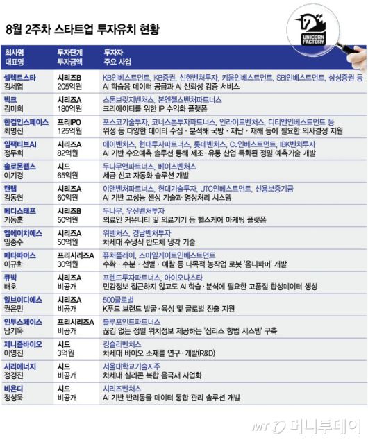 8월 둘째주(11~15일)에는 셀렉트스타, 빅크, 한컴인스페이스, 임팩티브AI, 솔로몬랩스, 캔랩, 메디스태프, 엠에이치에스(MHS), 메타파머스, 큐빅, 알브이디에스(RVDS), 인투스페이스, 제니즘바이오, 시리에너지, 비욘디 등 15개 스타트업이 투자유치 소식을 전했다.