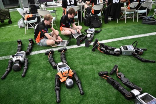 4일 네덜란드의 테크 유나이티드 에인트호번 팀 소속 멤버들이 베이징에서 열릴 세계 휴머노이드 로봇 경기 대회를 앞두고 로봇을 설치하고 있다. 이번 대회는 8월 15일부터 17일까지 베이징에서 개최될 예정이다.2025.08.04. /AFPBBNews=뉴스1 |