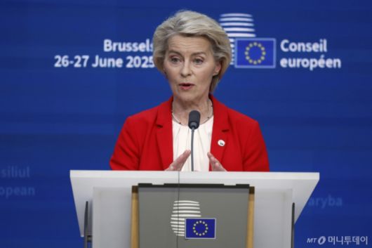 [브뤼셀(벨기에)=AP/뉴시스]우르줄라 폰 데어 라이엔 유럽연합(뗘) 집행위원장이 26일 브뤼셀에서 열린 EU 정상회의 후 기자회견을 열고 있다. EU 일부 지도자들은 세계 무역 시스템의 중심 기구 세계무역기구(WTO)에 대한 재검토를 논의했다고 CNN이 26일(현지시각) 보도했다. 2025.06.27. /사진=유세진 |