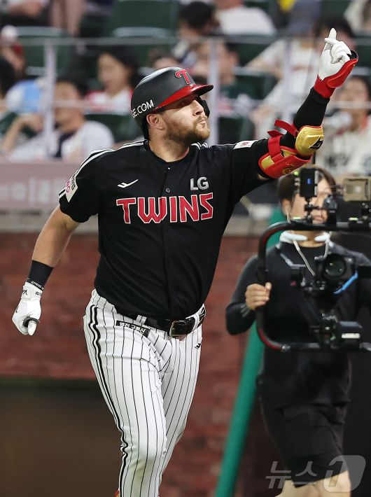(인천=뉴스1) 김진환 기자 = 17일 오후 인천SSG 랜더스필드에서 열린 '2025 신한 SOL뱅크 KBO리그' LG 트윈스와 SSG 랜더스의 경기, LG 오스틴이 8회초 선두타자로 나와 솔로홈런을 친 뒤 관중석 가족들을 향해 손가락 하트를 하고 있다. 2025.8.17/뉴스1
