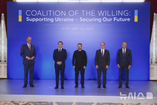 [키이우=AP/뉴시스] 지난 5월 우크라이나 키이우 대통령궁에서 프리드리히 메르츠 독일 총리(왼쪽부터), 에마뉘엘 마크롱 프랑스 대통령, 볼로디미르 젤렌스키 우크라이나 대통령, 키어 스타머 영국 총리, 도날트 투스크 폴란드 총리가 '의지의 연합' 회담에 앞서 기념 촬영을 하고 있다. 2025.05.11. |