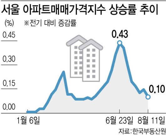 17일 한국부동산원에 따르면 8월 둘째주 서울 아파트 매매가격지수는 첫째주 대비 0.10% 오르며, 첫째주 상승폭인 0.14%에 비해 다소 하락했다. 대선을 전후로 서울 아파트 가격 상승률은 급격히 그 폭을 키우면서 지난 6월 셋째주 0.43%까지 치솟았지만, 정부의 6.27대책 이후 완만히 둔화하며 지난 5월 둘째주(0.10%) 이후 석 달 만에 최저치를 기록했다.