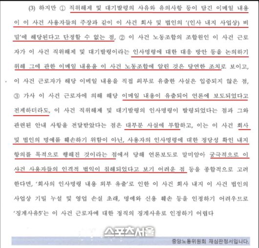 KPGA 징계 당사자가 노조를 통해 대응을 논의하기 위해 이메일 등 징계 내용을 송부하고, 해당 사실이 언론에 보도된 것은 징계사유가 될 수 없다고 판단한 중앙지방노동위원회(위)와 경기지방노동위원회 판정서 발췌. 사진 | 스포츠서울 |