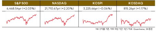 18일 조준기 SK증권 연구원에 따르면 지난주 글로벌 증시는 강세 흐름을 이어갔지만, 한국 증시는 미국 대비 언더퍼폼하는 모습이 나타났다. 미국에서는 인플레이션 관련 지표가 혼재된 가운데 시장 반응이 제한적이었다. 7월 소비자물가지수(CPI)는 예상치와 대체로 부합했으나, 생산자물가지수(PPI)는 시장 예상치(+0.2%)를 크게 웃돈 전월 대비 +0.9%를 기록했다.
