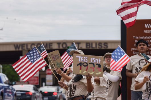 미국 텍사스주 엘파소 포트 블리스 미군 기지 앞 캐시디 게이트에서 17일(현지시간) 이민세관단속국(ICE)의 대규모 추방 정책에 반대하는 시위대가 플래카드를 들고 항의하고 있다. [로이터]