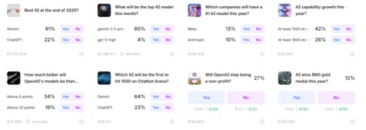 대표적으로 AI의 성과에 돈을 거는 예측 시장을 꼽을 수 있다. 월스트리트저널(WSJ)에 따르면 칼시, 폴리마켓과 같은 플랫폼에는 AI 성능은 물론 ‘샘 올트먼이 오픈AI의 지분을 받을까’와 같은 주제를 두고 매달 수천만 달러 규모의 베팅이 오가고 있다.
