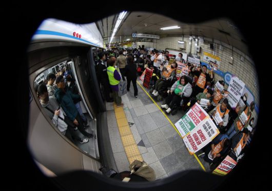 18일 서울교통공사와 전장연에 따르면 전장연은 이날 오전 7시 30분께부터 명동역 플랫폼에서 지하철 탑승 시위를 벌이며 공사 측 직원들과 대치했다.