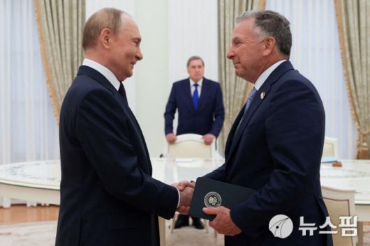 [모스크바 로이터=뉴스핌] 장일현 특파원 = 블라디미르 푸틴(왼쪽) 러시아 대통령이 6일(현지 시간) 러시아 모스크바 크렘린궁에서 도널드 트럼프 미국 대통령의 특사 스티브 위트코프를 만나 악수하고 있다. 2025.08.06. ihjang67@newspim.com |