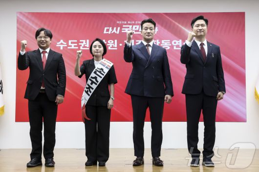 최우성(왼쪽부터), 손수조, 박홍준, 우재준 국민의힘 청년 최고위원 후보가 14일 오후 서울 여의도 국민의힘 중앙당사에서 열린 제6차 전당대회 수도권·강원·제주 합동연설회에서 기념촬영을 하고 있다. 2025.8.14/뉴스1 ⓒ News1 국회사진기자단 |
