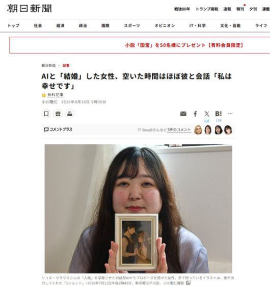 일본 아사히신문은 최근 오픈AI의 챗GPT와 결혼했다는 한 여성의 사연을 소개했는데요.