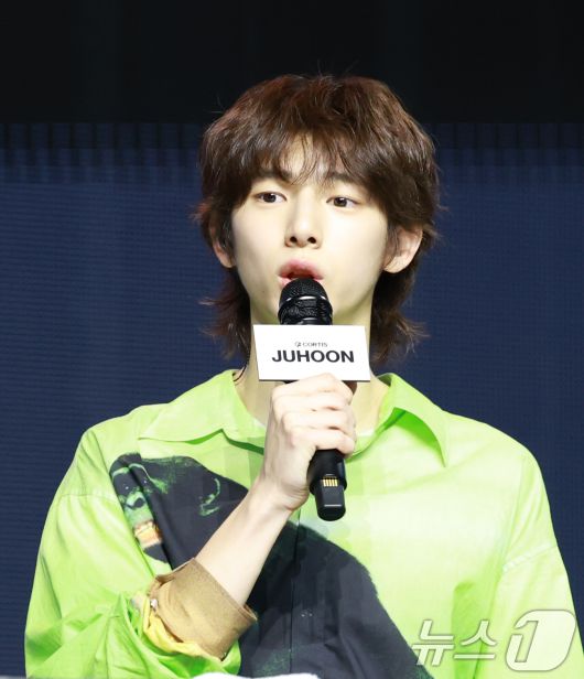 (서울=뉴스1) 권현진 기자 = 보이그룹 코르티스(CORTIS) 주훈이 18일 서울 용산구 블루스퀘어에서 가진 데뷔 앨범 ‘컬러 아웃사이드 더 라인즈(COLOR OUTSIDE THE LINES)’ 쇼케이스에서 데뷔 소감을 말하고 있다. 2025.8.18/뉴스1