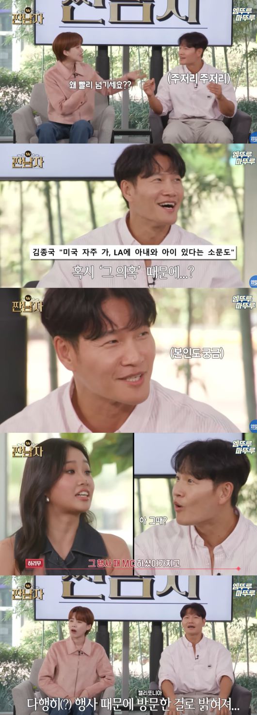 또한 미국에 공연을 위해 자주 간다는 김종국은 "(소문에는) 딸이 이제 대학교에 들어간다. UCLA라더라. 아들도 있다. 디테일하다"며 자신도 구체적이고 오래 된 소문에 대해 알고 있음을 밝혔다.