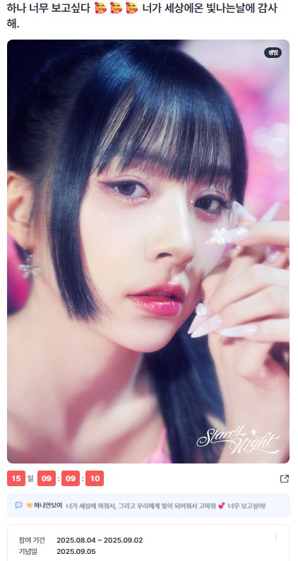 '하나 너무 보고싶다 너가 세상에온 빛나는날에 감사해.'라는 제목으로 개설된 이번 이벤트는 18일 오후 2시 50분 기준 2800 하트를 기록했다. 팬들은 "세상에 온 날 정말 소중하고 고마워", "너무 보고싶어" 등 진심 어린 댓글을 남기며 축하에 동참하고 있다. 이벤트 종료일까지 응원 열기가 계속될 것으로 보인다.