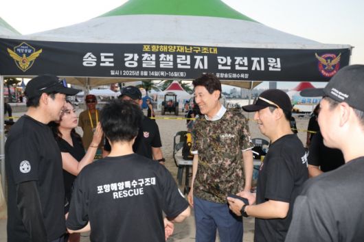 2025 해양 레포츠 플레이 그라운드 현장을 찾은 이강덕 포항시장(가운데). |