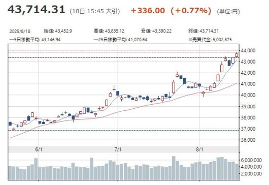 이날 닛케이225평균주가지수는 전일 종가보다 0.77%(336.00엔) 상승한 4만3714.31엔에 거래를 마쳤다. 도쿄증권거래소주가지수(TOPIX, 토픽스)도 0.43%(13.28포인트) 오른 3120.96포인트로 마감했다.
