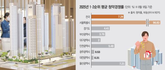 올해 전체를 봐도 서울만 두드러진다. 부동산R114의 자료를 보면 올해 전국 기준 1·2순위 평균 청약경쟁률은 7.28대 1인데 서울은 96.83대 1로 100대 1에 가깝다. 광주(0.53대 1)와 대전(0.31대1), 전남(0.21대1), 제주(0.48대1)는 소수점 경쟁률에 불과하다.