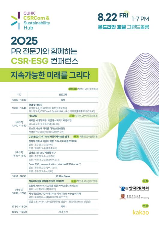 한국PR학회는 홍콩 중문대와 공동으로 오는 22일 서울 이태원 몬드리안 호텔 그랜드볼룸에서 PR 전문가와 함께하는 ‘지속가능한 미래를 그리다: 2025 한국 CSR×ESG 컨퍼런스’를 개최한다고 18일 밝혔다.
