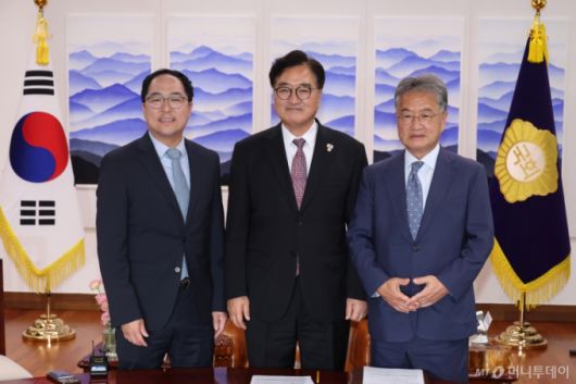 [서울=뉴시스] 고승민 기자 = 우원식(가운데) 국회의장이 18일 서울 여의도 국회에서 앤디 김(왼쪽) 미국 연방 상원의원과 조셉 윤 주한미국대사대리를 접견, 기념촬영하고 있다. 2025.08.18. kkssmm99@newsis.com /사진=고승민 |