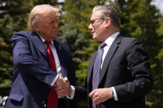 도널드 트럼프(왼쪽) 미국 대통령과 키어 스타머 영국 총리가 6월 16일(현지 시간) 캐나다 카나나스키스에서 주요 7개국(G7) 정상회의를 계기로 회담 후 악수하고 있다. 트럼프 대통령은 영국산 자동차뿐만 아니라 철강과 알루미늄에도 면세 쿼터를 허용하기로 하는 등 지난 5월 발표한 무역 합의 내용 일부를 이행하도록 하는 행정명령에 서명했다./AP=뉴시스 |