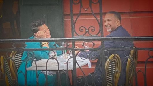 와인잔을 앞에 두고 다정히 식사 중인 두 사람.