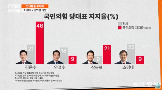 ▶ 조경태: 아무래도 전국적인 인지도가 높은 김문수 후보가 될 확률이 높다는 현실적인 현실성을 배제할 수 없을 것 같고요. 그래서 국민 여론조사에서도 보면 제가 1위고 김문수 후보가 2위가 나오거든요? 그래서 아마 1, 2위 싸움이 아니겠느냐 이렇게 보고 있습니다.