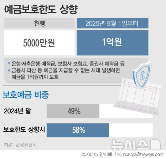 [서울=뉴시스] 오는 9월부터 예금자 보호한도가 5000만원에서 1억원으로 상향된다. 보호한도가 확대되는 것은 2001년 이후 24년 만이다. 보호한도 상향으로 예보의 보호예금 비중은 지난해 말 기준 49%에서 58%로 241조원 늘어난다. 예금자들이 기존 5000만원 한도 내에서 여러 금융사에 나눠 예치하던 불편도 줄어들 전망이다. (그래픽=안지혜 기자) hokma@newsis.com |
