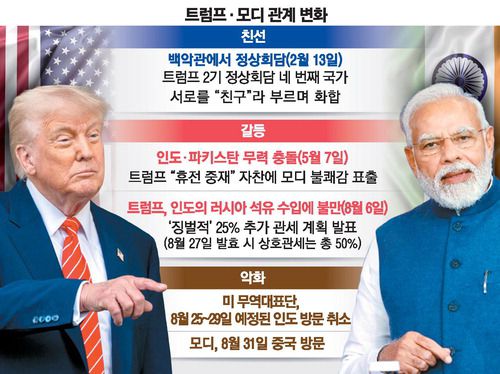 미국은 인도가 러시아와 원유에 더해 군사장비 등을 거래하는 것을 제재하려 한다. 인도의 농업·낙농업 시장 개방도 양측이 힘겨루기 중인 주요 이슈다. 사실상 징벌적 성격의 관세폭탄을 투하했는데도 인도와 진행하는 무역협상에 진전이 없자 조기 관세협상을 이룰 가능성도 없애버린 것으로 보인다.