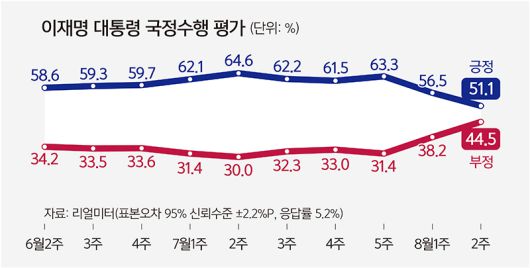 여론조사 전문업체 리얼미터가 에너지경제신문 의뢰로 지난 11∼14일 조사한 8월 2주차 정례조사 결과, 이 대통령 국정수행 평가 조사 결과 ‘잘하고 있다’는 긍정평가는 51.1%, ‘잘못하고 있다’는 부정평가는 44.5%로 나타났다. 긍정평가는 전주 대비 5.4%포인트 떨어진 반면, 부정평가는 반대로 6.3%포인트 올랐다. 이 대통령 국정수행 긍정평가율은 7월 내내 60%대 초중반을 유지하다 8월 1주차 조사에서 56.5%로 떨어졌고 이번주 조사에서도 추가 하락했다. 취임 후 최저치다.