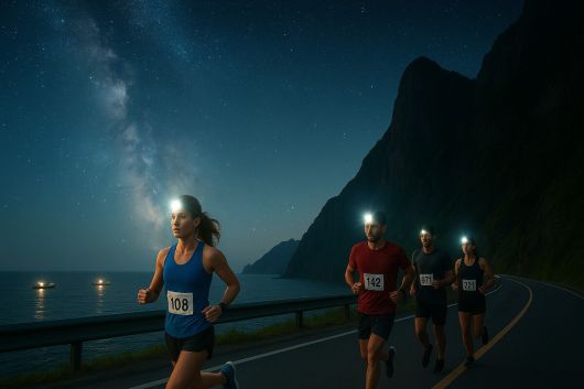 런닝대회는 이달 오후 9시 울릉 도동항 여객선 터미널 정문 앞을 출발해 오징어를 잡기위한 채낚기 어선 군락의 집어 조명 야경과 수 많은 별들이 수놓은 밤하늘을 감상하며 반환점인 내수전 해변까지 뛴 후 다시 출발지로 7일 자정까지 되돌아오는 약 10km 코스로 구성됐다.