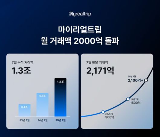 국내 대표 여행 슈퍼앱 (주)마이리얼트립(대표 이동건)은 올해 7월 월간 거래액(GMV)이 2171억 원을 기록하며 역대 최고치를 경신했다고 밝혔다.