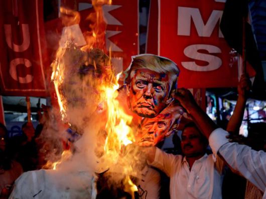 13일 인도 시위대가 동부 콜카타에 위치한 미국 대사관 밖에서 도널드 트럼프 미국 행정부의 관세 정책에 항의하고 있다. 콜카타=EPA 연합뉴스 |