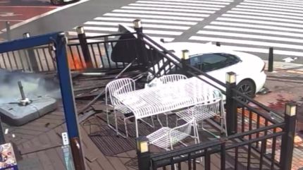 흰색 승용차가 건물을 향해 빠르게 돌진합니다.