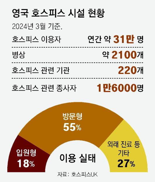 영국 호스피스 협의체 호스피스UK에 따르면 영국에서는 약 220개의 독립 호스피스가 운영되고 있다. 호스피스 의료진이 가정에 방문해 진료하는 가정 방문형 호스피스 사례도 많아 호스피스 이용자는 약 30만 명에 달한다. 이용자들은 전액 무료로 서비스를 이용한다. 운영에 필요한 자금은 기부금, 자선 활동 등을 통해 마련한다.