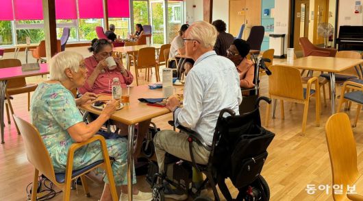 지난달 14일 영국 런던 세인트 크리스토퍼 호스피스. 암 환자 팜 에릿 씨(91)는 정원이 보이는 1층 식당에서 다른 외래 환자들과 함께 점심 식사를 하고 있었다. 에릿 씨는 “매주 한두 차례 찾아와 진료를 받고 통증 관리를 한다. 여기 오면 마음이 편안해져 내가 죽는다는 게 별로 걱정되지 않는다”고 말했다. 전립샘암을 앓고 있는 마이클 자비스 씨(92)도 “병원 밥이 아닌 일반식을 먹을 수 있어 좋다”고 했다.