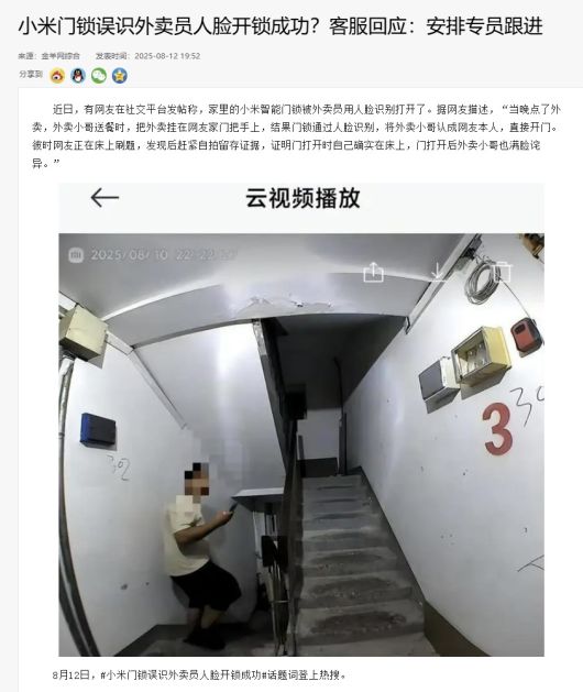 중국 IT 기업 샤오미의 스마트 도어락 제품이 음식 배달 기사의 얼굴을 거주자로 잘못 인식해 현관문 잠금장치를 푸는 황당한 일이 중국 현지에서 발생했다.