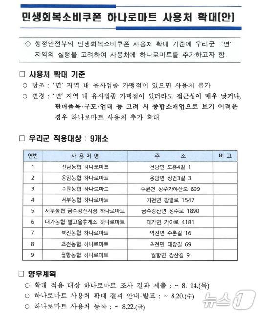 성주군도 선남·용암·수륜·가천·금수강산·대가·벽진·초전·월항 등 9개 면 지역 하나로마트를 사용처로 지정해 달라고 제출했으며, 하동군도 화개·악양·횡천·금남·금성·진교·북천·청암·옥종 등 9개소 하나로마트 확대를 요청했다.