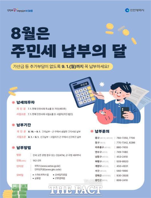 [더팩트ㅣ인천=김재경 기자] 인천시는 8월 주민세 납부의 달을 맞아 납부 대상자들에게 기한 내 신고·납부를 당부했다.