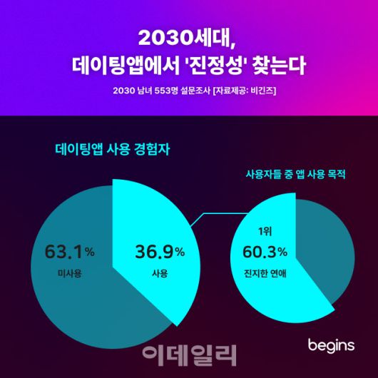 비긴즈 관계자는 “진지한 만남과 검증된 상대에 대한 높은 선호를 바탕으로 신뢰도 높은 브랜드 메시지를 구축하겠다”며 “진지한 연애, 친구 만들기 등 이용자의 사용 목적에 따라 다양한 매칭을 할 수 있도록 할 것”이라고 말했다.