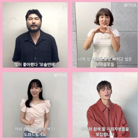 19일 넷플릭스에 따르면 모태솔로 출연자 모집이 오늘(19일) 시작됐다. 썸메이커스 서인국, 강한나, 이은지, 카더가든이 시즌2 지원자 모집에 직접 발벗고 나섰다.