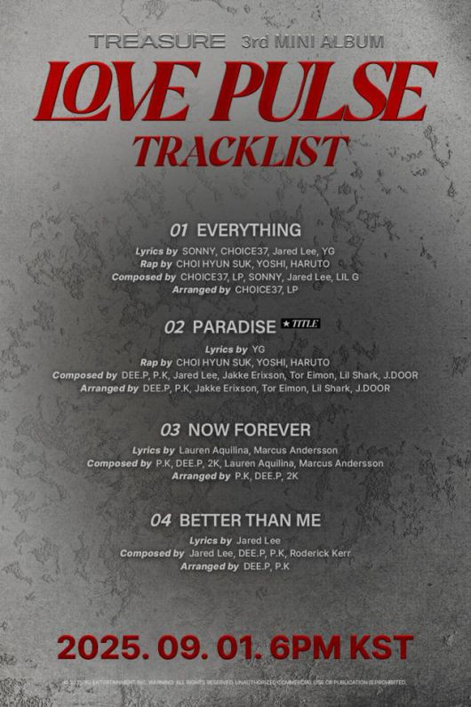 그룹 트레저가 오는 9월 1일 발매 예정인 미니 3집 '러브 펄스(LOVE PULSE)'의 전곡 트랙리스트와 크레딧을 전격 공개했다.
