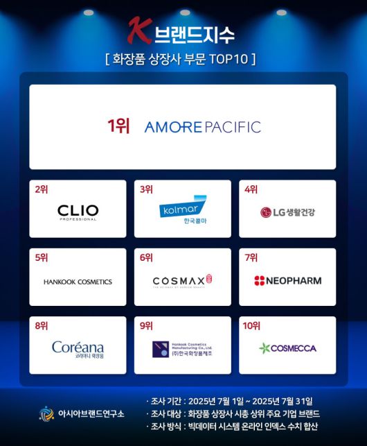 분석 결과 아모레퍼시픽이 1위를 수성했고, 이어 클리오(2위), 한국콜마(3위), LG생활건강(4위), 한국화장품(5위), 코스맥스(6위), 네오팜(7위), 코리아나(8위), 한국화장품제조(9위), 코스메카코리아(10위)가 톱10에 이름을 올렸다.