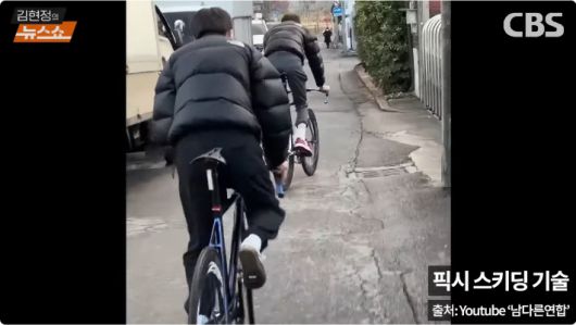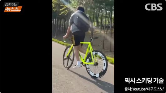 ◇ 김현정> 디자인, 빠른 속도 거기다가 기술 부리기에 좋다. 기술 부리기에 좋다가 무슨 말인지를 저희가 유튜브와 레인보우로 지금 영상으로 보여드리고 있습니다. 이게 실제로 청소년들이 자신이 픽시 자전거로 기술 부리는 모습을 SNS에 올린 걸 저희가 모아봤거든요. 뭐냐 하면은 픽시 자전거를 타고 이걸 뭐라고 설명해야 돼, 스키딩 기술?