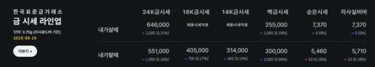 [스타데일리뉴스=서태양기자] 한국표준금거래소 8월 19일 기준 24K 순금 시세는 투자자들의 관망세에 하락세를 보였다. 3.75g당 순금 가격은 내가 살 때 646,000원으로 전일 대비 2,000원(-0.31%) 하락했다. 판매 가격 또한 551,000원으로 1,000원(-0.18%) 하락하며, 순금 가격 하락 흐름을 보였다.